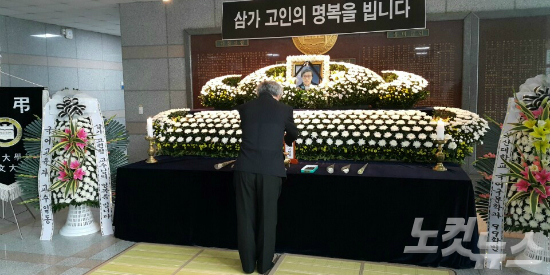 19일 부산대 본관 1층 로비에 마련된 고(故) 고현철 교수 분향소에서 한 교직원이 조문을 하고 있다. (사진=부산CBS 박중석 기자)