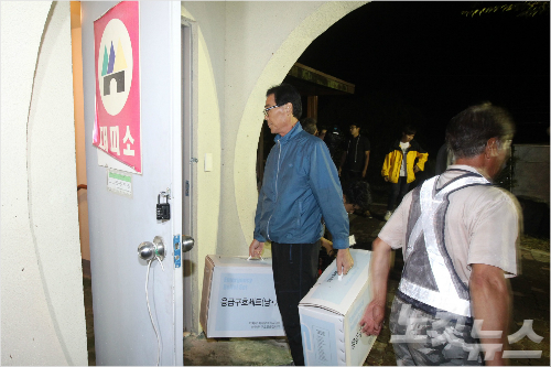 20일 북한군의 서부전선 포격과 관련, 접경지역인 경기 연천·파주·김포와 인천 강화지역 주민 약 2천명에게 대피명령이 내려진 가운데 경기 연천군 삼곶리 중면사무소 대피소에서 관계자들이 응급구호물품을 옮기고 있다. (박종민 기자)
