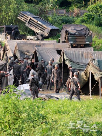 남북이 '마라톤 협상'을 벌이고 고위급 접촉을 재개하기로 한 23일 경기도 연천군 중서부전선에서 육군 다련장 로켓 차량이 비상 대기하고 있다.