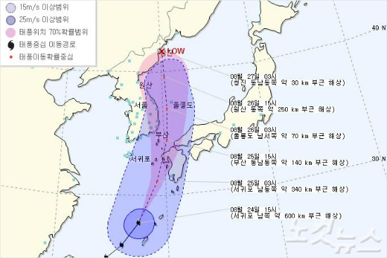 제주도남쪽먼바다에 태풍주의보를 발표한 제주지방기상청은 25일까지 100㎜에서 200㎜, 산간을 중심으로 많은 곳은 300㎜의 비가 오겠다고 예보했다.