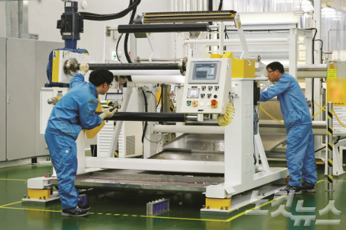 LG화학 청주 수처리용 RO필터 생산 라인에서 LG화학 임직원들이 RO필터의 핵심 소재인 멤브레인 생산 과정을 확인하고 있다. (사진=LG화학 제공)