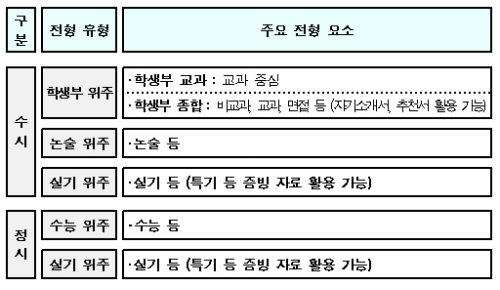 대교협 관계자는 "과도한 수험생 부담을 유발하는 전형 유형을 방지하기 위해 학생부가 주된 전형 요소가 되도록 대입을 설계하고, 보완적으로 수능 및 대학별 고사가 실시되도록 할 계획"이라고 설명했다.