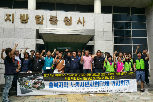 민주노총 충북지역본부와 비정규직없는 충북만들기운동본부, 충북시민단체연대회의는 27일 청주고용노동지청 앞에서 기자회견을 열고 "현장 특별감독 기간 휴업에 들어가는 것은 또 다른 산재 은폐 행위"라고 주장했다.