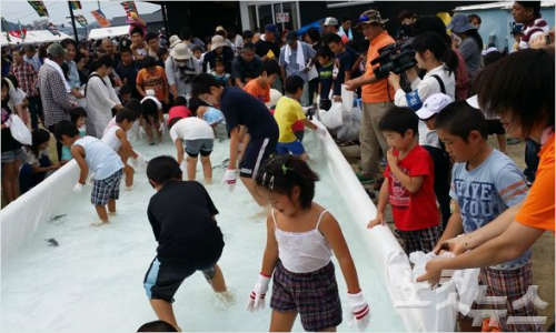 그리고 제일 인기 많은 이벤트는 이것은 아이만 놀 수 있는 이벤트 인데요. 오징어, 물고기 뽑기. 이것이 뭐냐면 수심이 얕고 작은 풀 안에서 헤엄치는 오징어나 물고기를 손으로 뽑고, 뽑은 오징어나 물고기는 곧 회나 튀김으로 먹을 수 있습니다. 이것은 9월 19일날 10시부터 15시까지 합니다.