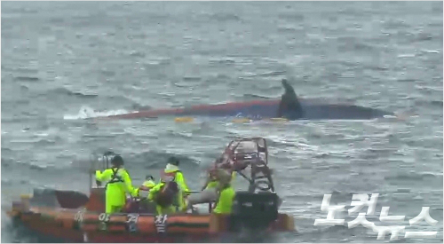 지난 6일 오전 6시 25분쯤 제주 추자도 인근 해상에서 전남 해남선적 9.77톤급 낚시어선 돌고래호가 전복된 채 발견됐다. (사진=제주해경 동영상 캡처)