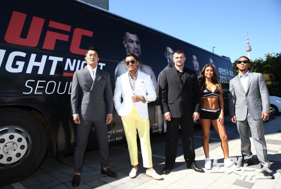 8일 서울 중구 반야트리호텔에서 열린 'UFC Fight Night 서울티켓 오픈 기자간담회에서 (왼쪽부터)김동현, 추성훈, 미르코 필리포빅, 옥타곤걸 아리아니 셀레스티, 벤슨 헨더슨이 포즈를 취하고 있다.