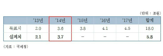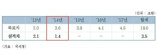 실제 국세청에서 제출한 자료로 2012년 아닌 2013년 실적 대비 2014년 실적을 계산했더니 실제 실적은 1조 4천억원에 그쳤다.