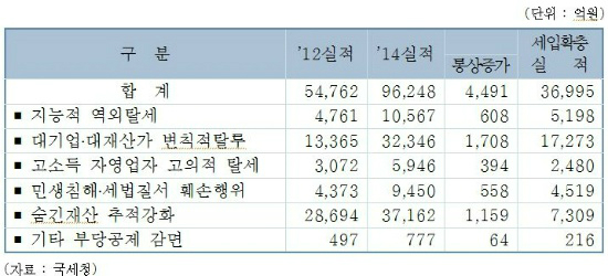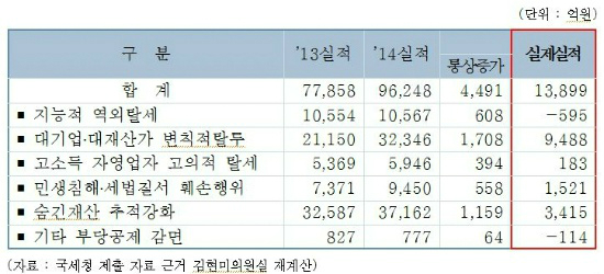 국세청이 발표한 2014년 지하경제양성화 실적 (표=김현미의원실 제공)