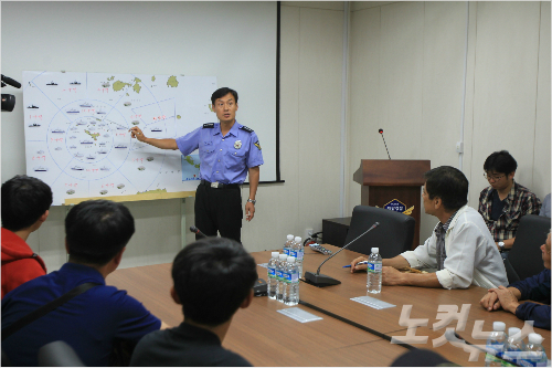 돌고래호 실종자 가족들이 11일 오전 제주해양경비안전본부 성기주 경비안전과장으로부터 수색상황을 청취하고 있다. (사진=제주CBS 이인 기자)