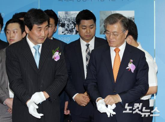문재인 새정치민주연합 대표와 이종걸 원내대표가 13일 서울 여의도 국회의사당 의원회관에서 열린 창당 60년 사진전 개막식에서 장갑을 착용하고 있다.