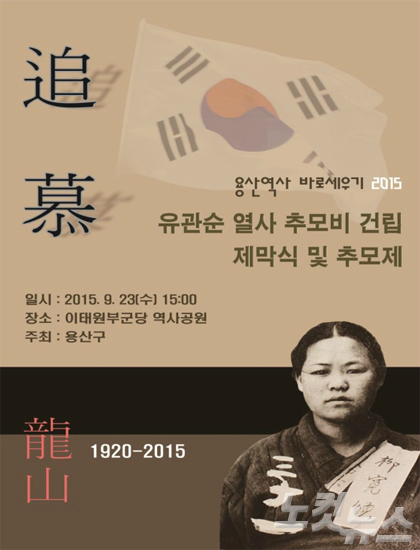 서울 용산구(구청장 성장현)는 15일 유관순 열사 순국 95년과 광복 70주년을 맞아 오는 23일 이태원부군당 역사공원에서 유관순 열사 추모비 건립 추모제를 진행한다고 밝혔다.