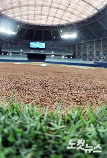 국내 최초 돔야구장 '고척스카이돔'이 09년 2월 첫 삽을 뜬 지 약 7년 만에 완공, 한국야구 돔구장 시대가 본격 개막했다. 사진은 15일 서울 구로구 국내 최초 돔야구장 '고척스카이돔'의 미디어데이 행사에서 공개된 돔구장 전용 인조잔디와 메이저리그 전용 흙. 고척돔은 내년부터 넥센히어로즈가 홈구장으로 사용할 예정이다.