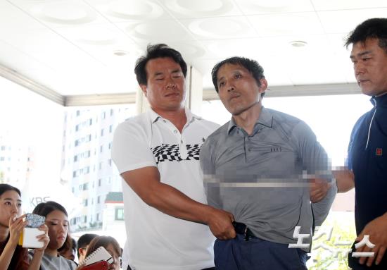 서울의 한 빌라에 주차된 차량 트렁크에서 숨진 채 발견된 30대 여성을 살해한 용의자 김일곤(48)씨가 범행 8일 만에 검거됐다. 주모(35.여)씨를 납치해 살해한 혐의(강도살해)로 공개수배한 김 씨가 불만스러운 표정으로 17일 서울 성동경찰서로 압송되고 있다. 김 씨는 살인 이유를 묻는 취재진의 질문에 "나는 잘 못한 게 없어요! 난 앞으로 더 살아야 한다"고 답했다.