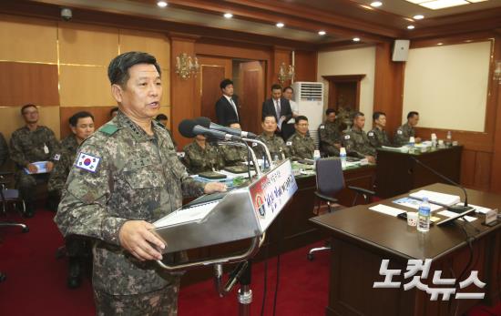 18일 오전 강원도 원주 육군 제1야전군사령부에서 열린 국회 국방위원회 국정감사에서 김영식 야전군사령관이 인사말을 하고 있다.
