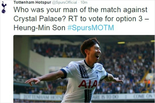 손흥민은 토트넘 구단이 실시한 트위터 투표에서 10분 만에 604차례 RT를 기록했다 (사진=토트넘 구단 트위터 캡처)