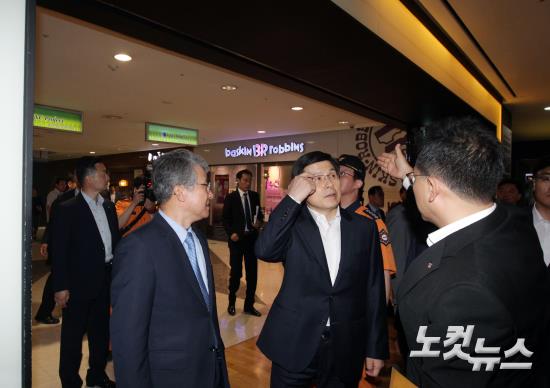황교안 국무총리가 21일 서울 용산구 아이파크몰 내 CGV용산점을 방문, 방화셔터 작동현황을 점검하기 위해 셔터 위치를 찾고 있다.