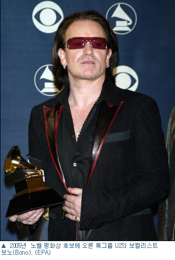 음악을 통해 전쟁과 테러에 대해 평화적 외침을 해오던 관록의 록그룹 U2의 보컬리스트 ''보노(Bono)''가 2005년 노벨 평화상 수상자 후보 명단에 이름을 올렸다.