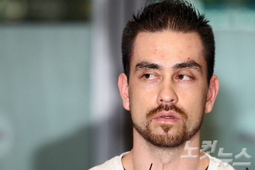 '이태원 살인 사건'의 진범으로 지목된 미국인 아더 존 패터슨이 23일 인천국제공항을 통해 국내로 송환, 취재진의 질문에 답하고 있다. (사진=윤성호 기자)