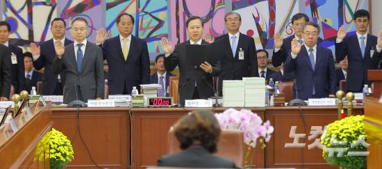 박병대 법원행정처장을 비롯한 관계자들이 7일 오전 서울 서초동 대법원에서 열린 국회 법제사법위원회 대법원과 법원행정처 등에 대한 국정감사에서 선서를 하고 있다.