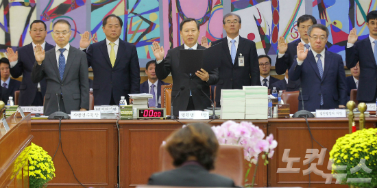 박병대 법원행정처장을 비롯한 관계자들이 7일 오전 서울 서초동 대법원에서 열린 국회 법제사법위원회 대법원과 법원행정처 등에 대한 국정감사에서 선서를 하고 있다. (사진=박종민 기자)
