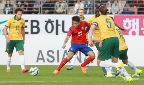 9일 오후 경기도 화성종합경기타운에서 열린 축구 올림픽대표 평가전 대한민국과 호주의 경기 전반전, 지언학이 상대 수비를 피해 패스하고 있다.