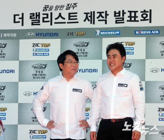 '더 랠리스트' 심사위원인 김재호 자동차경주협회 사무국장과 박정룡 아주자동차대 모터스포츠학과 교수가 14일 오후 서울 상암동 SBS 프리즘타워에서 열린 랠리 드라이버 오디션 프로그램 ‘더 랠리스트’ 제작발표회에 참석해 포즈를 취하고 있다. SBS ‘더 랠리스트’는 국가대표 랠리 드라이버를 선발해 세계적 기술력에 걸맞은 월드클래스 드라이버로 육성시키는 프로그램이다.