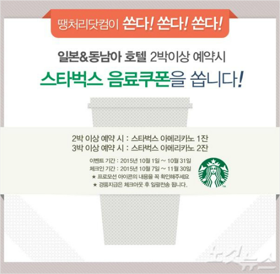 땡처리닷컴이 10월 한 달간 일본·동남아 지역 호텔 예약 고객 대상으로 '스타벅스 커피'를 증정하는 이벤트를 진행한다.