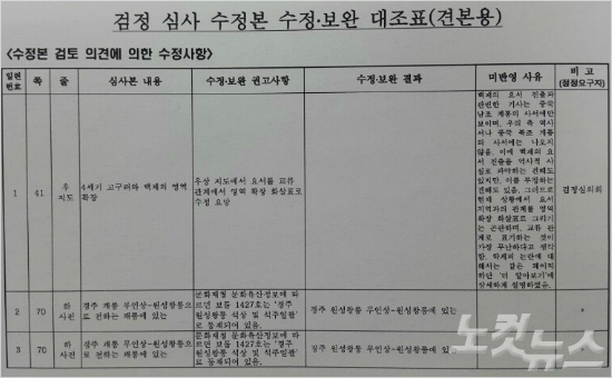 금성출판사 고교 한국사 교과서에 대한 검정심의회의 '검정심사 수정보완 대조표' 일부(자료=새정치민주연합 도종환 의원실 제공)