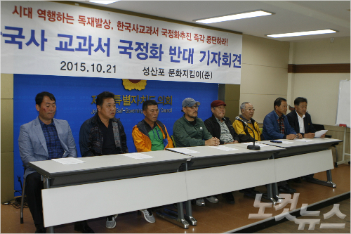 이들은 21일 오전 제주도의회 도민의방에서 기자회견을 열어 "한국사 교과서 국정화는 친일과 독재를 미화하고 역사를 왜곡하는 사상의 강압"이라고 주장했다.