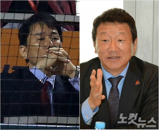 최근 일본계 금융회사 J트러스트와 메인 스폰서 계약이 진행 중인 사실이 밝혀진 히어로즈 야구단 이장석 대표(왼쪽)와 프로배구 OK저축은행 구단주인 최윤 그룹 회장.(자료사진)