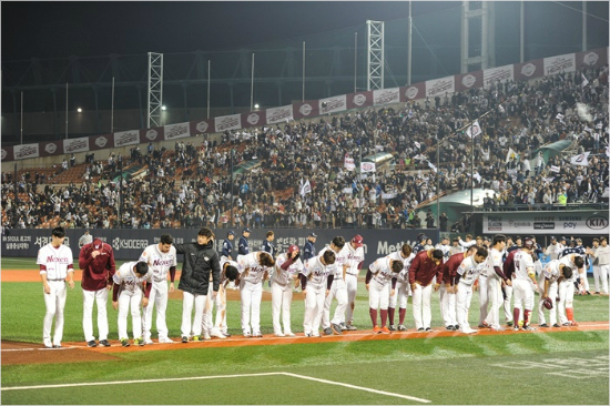 '넥센으로서 마지막 인사?' 두산과 준플레이오프 4차전에서 진 뒤 넥센 선수들이 팬들에게 인사하는 모습.(자료사진=넥센)