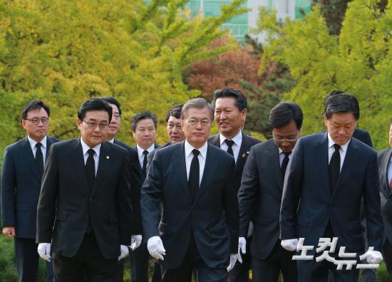 문재인 새정치민주연합 대표를 비롯한 지도부가 26일 서울 용산구 효창공원 삼의사 묘역에 참배하기 위해 들어서고 있다.