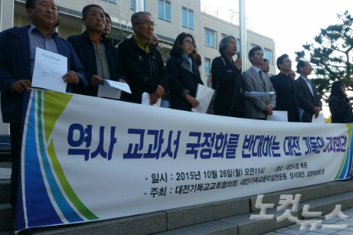 대전기독교교회협의회 등 기독교 단체는 26일 "역사교과서 국정화의 본질은 교과서를 학계와 교육계가 아닌 정치권력이 장학하겠다는 것"이라며 "박근혜 정부는 역사교과서의 국정화 시도를 즉각 중단하라"고 촉구했다.