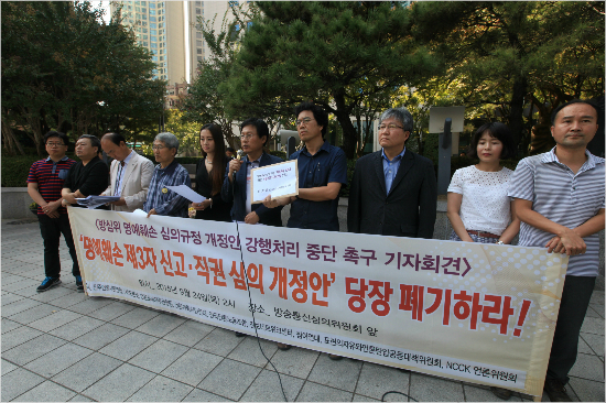 사진은 지난 9월 24일 언론·시민단체들이 목동 방송회관 방심위 앞에서 '명예훼손 심의규정 개정한 폐기 촉구 기자회견'을 열었던 모습. (자료사진/언론노조 제공)