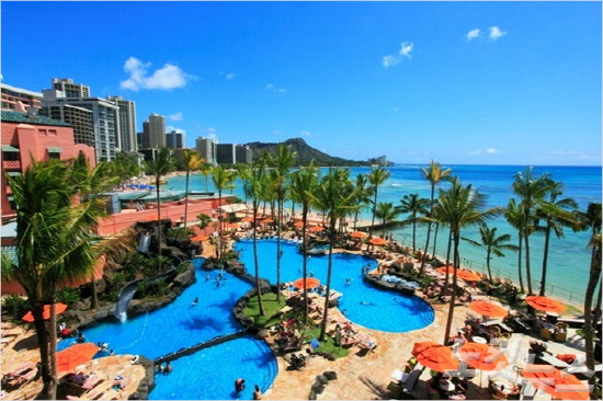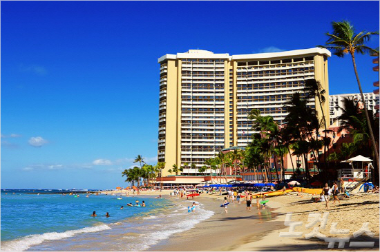 하와이 와이키키 해변에 자리한 쉐라톤 와이키키 호텔은 지리적 이점과 아름다운 뷰를 동시에 갖춘 대형 리조트다.