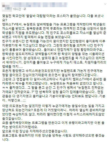 해외 알바를 미끼로 교내 학생들을 소집하고 알바는 커녕 황당한 면접 후 몰래카메라 였다며 학생들을 울린 한 대학 방송국이 논란이다.