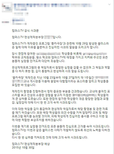 이에 몰카를 기획했던 교내 방송 편성제작본부장은 해당 페이스북에 사과문을 올리며 학생들에게 용서를 구했다.