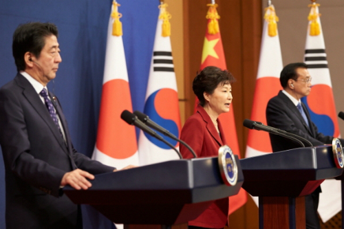 박근혜 대통령과 아베 신조 일본 총리, 리커창 중국 총리가 1일 오후 청와대 춘추관에서 공동기자회견을 하고 있다. (사진=청와대 제공)