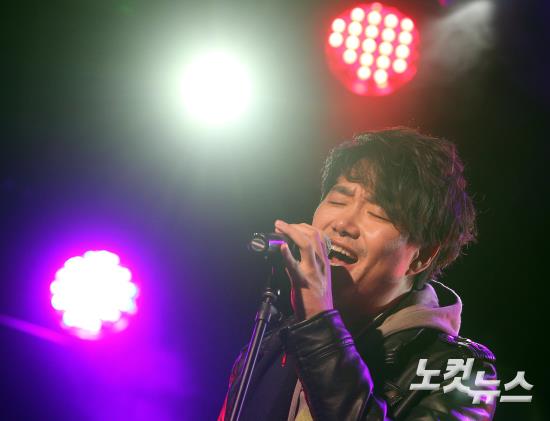 11년 만에 가요계에 컴백한 김태욱이 2일 오전 서울 서교동 롤링홀에서 첫 번째 싱글앨범 ‘김태욱의 마음에는 그대가 살고 있나봐’ 쇼케이스를 갖고 열창을 하고 있다.