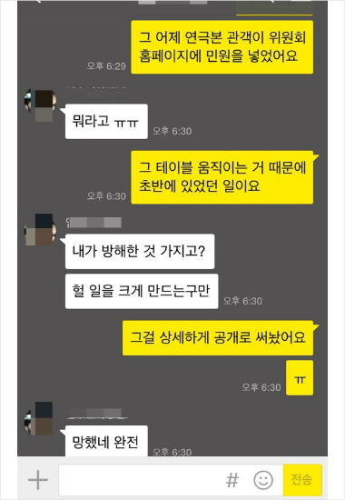 ◆ 이양구> 그렇죠. 취소가 됐고 또 하나는 공연취소 공지를 하지 않았어요. 그리고 현장에서 조용히 관객들을 돌려보냈습니다. 그리고 이런 모든 사태에 대해서 공연예술센터가 사실을 인정하고 진실한 사과를 할 것을 세 연출가가 1인 시위에 나서면서 요구를 했고요. 거기에 대해서 공연예술센터는 그런 내용을 게시판에 민원으로 냈거든요. 공연예술센터는 거기에 대해서 임수연 문화사업부장 개인의 비이성적 태도라는 이유로 그리고 담당직원의 오해였다라는 이유로.