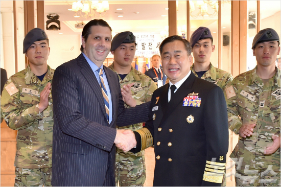 마크 리퍼트 주한 미국대사가 4일 해군특수전전단(UDT/SEAL) 창설 60주년 기념 세미나가 열린 진해 해군회관에서 정호섭 해군참모총장과 악수하고 있다. (사진=해군본부 제공)
