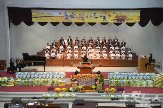 순천 제일교회의 추수감사주일 예배에 쌀 포대가 놓여 있다(사진=순천 제일교회)