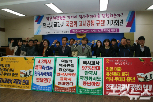 국정화 반대 제주연대는 "당초 고시 날짜인 5일을 이틀 앞당기며 마치 군사 작전하듯 일방적으로 발표했다"며 "역사 학자와 교사, 학생, 시민들의 반대 의견은 아랑곳 하지 않았다"고 밝혔습니다.