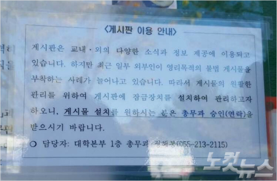 ◆이현아 : 네. 최근에 창원대학교가 학교에 정문게시판을 자물쇠로 잠궈서 학생들의 반발을 사고 있는데요. 자물쇠를 걸어 잠궈서 게시판의 이용을 막는 것은 굉장히 보수적이었던 학칙에도 근거 조항에 없는 것입니다.