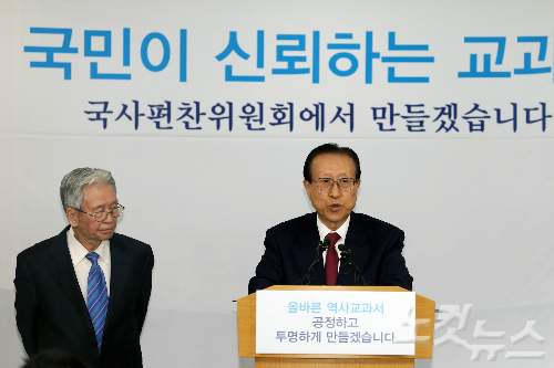 중.고등학교 역사 교과서 국정 도입이 확정된 4일 서울 종로구 정부종합청사에서 교과서 편찬을 맡은 국사편찬위원회 김정배 위원장이 교과서 개발 방향과 집필진 구성, 편찬 기준 및 개발 일정을 발표했다.(사진= 윤성호 기자)