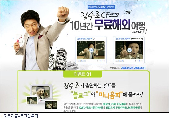 자유여행전문여행사 로그인투어(www.logintour.co.kr)는 영화배우 김수로가 모델로 등장한 CF 방영을 기념해 10년 무료 해외여행권을 증정하는 프리뷰 이벤트를 오는 31일까지 진행한다.