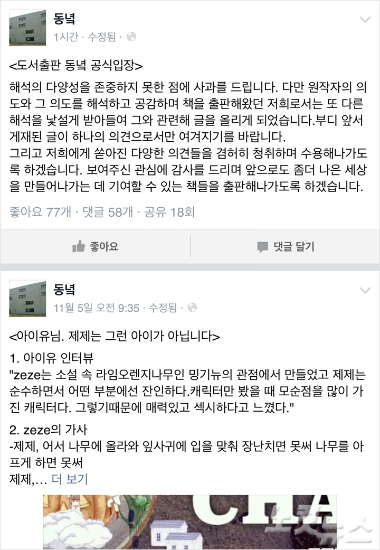 동녘은 10일 공식 페이스북에 "원작자의 의도와 그 의도를 해석하고 공감하며 책을 출판해왔던 저희로서는 또 다른 해석을 낯설게 받아들여 그와 관련해 글을 올리게 되었다"며 "부디 앞서 게재된 글이 하나의 의견으로서만 여겨지기를 바란다"고 전했다.