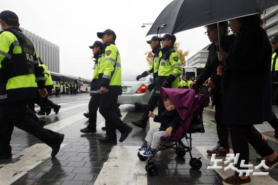 총 10만여명이 집결할 것으로 예고된 민중총궐기 대회를 앞두고 대규모 충돌이 우려되고 있는 14일 서울 종로구 세종로 일대에서 한 어린이가 순진무구한 얼굴로 카메라를 응시하고 있다.