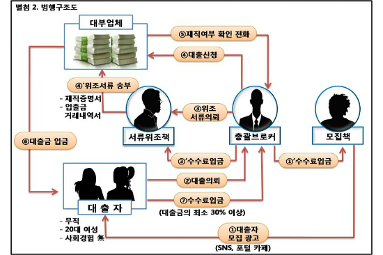 이와 함께 서류 위조책은 포토샵 프로그램을 이용하여 대출관련 서류인 '재직 증명서', '통장 거래 내역서', '병적 증명서', '사업자 등록증' 등을 위조한 뒤 웹팩스로 대부업체에 전송해주는 역할을 담당하고 대출 브로커들이 점조직으로 범행을 일삼아 검찰이 적발에 어려움을 겪었다.