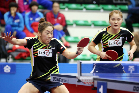 '그래 이게 내 갈 길이야' 렛츠런 박영숙(왼쪽)이 11월30일 팀 동료 김민희와 함께 '포스코에너지컵 2015 한국실업탁구대회' 여자 복식 결승에서 힘차게 백핸드를 구사하는 모습.(영주=월간 탁구)